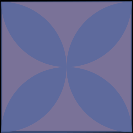 Tenim un parc quadrat de costat $10$ metres. Al mig de cada costat del parc hi ha plantat un arbre, que deixa una ombra circular de diàmetre igual al costat. Observem que hi ha llocs del terra on l’ombra que fan els arbres és doble.